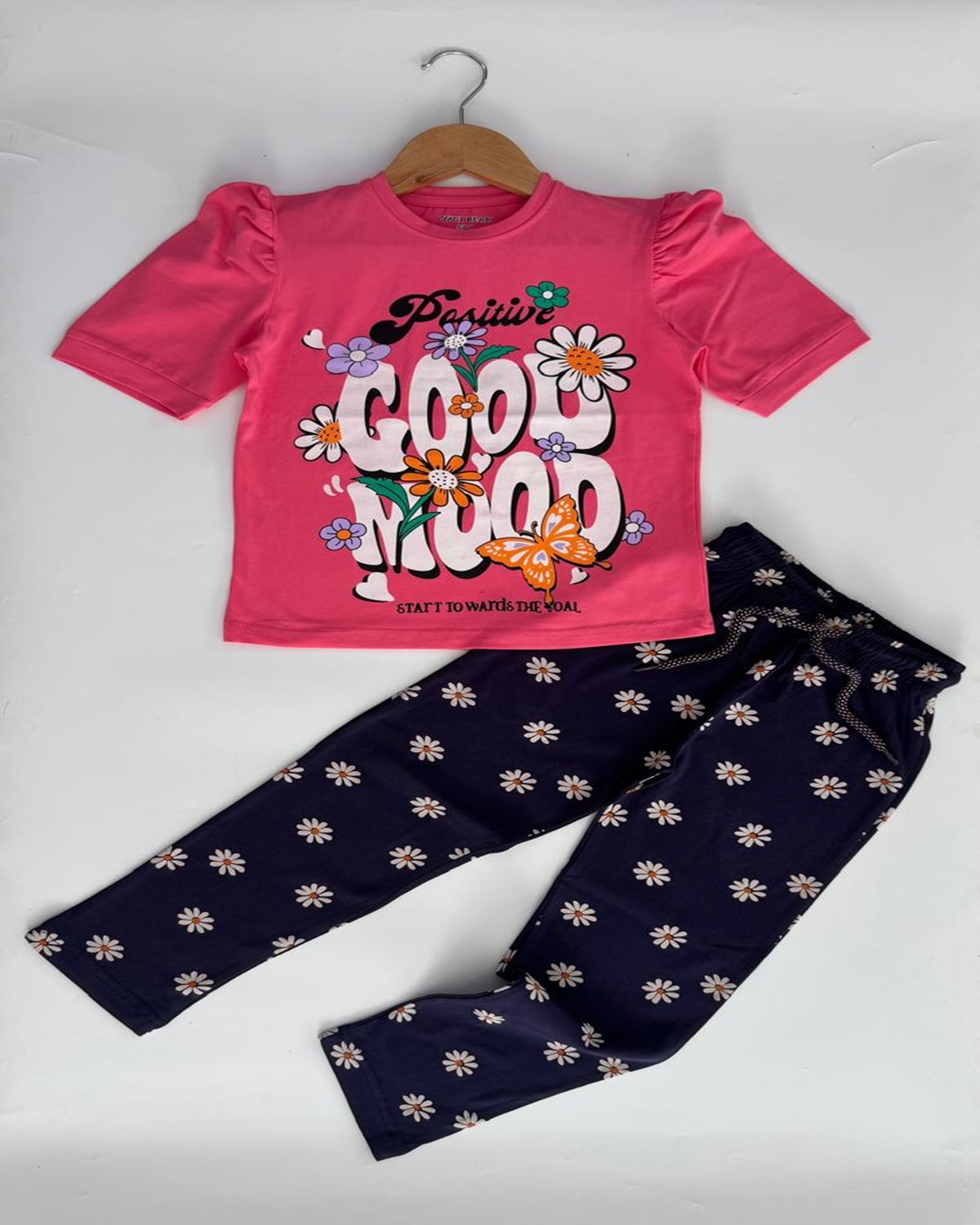 Add a touch of comfort and style to your little girl’s wardrobe with this Pale Watermelon Pink Floral T-Shirt & Navy Blue Printed Pyjama Set. Made from 100% bio-washed combed cotton jersey, this coord set is soft, breathable, and gentle on the skin. The floral print T-shirt with knee-length sleeves pairs perfectly with navy blue printed pyjamas featuring an elasticated waist, adjustable rope, and a handy one-side pocket. Designed for casual wear, playtime, or cozy lounging, this set offers the perfect blend of fashion and comfort.